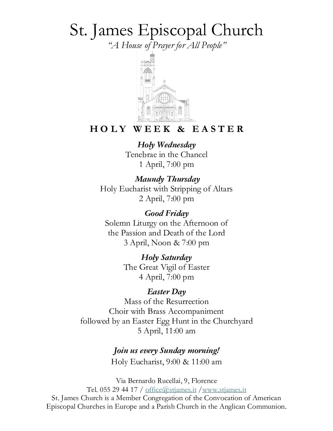 As the Rector of St. James and on behalf of our parish, I welcome you! St. James is a diverse and inclusive community ministering in English and Italian for more than a century. No matter who you are, no matter where you’re from, you have a home in Florence with us. – Reverend Richard B. Easterling